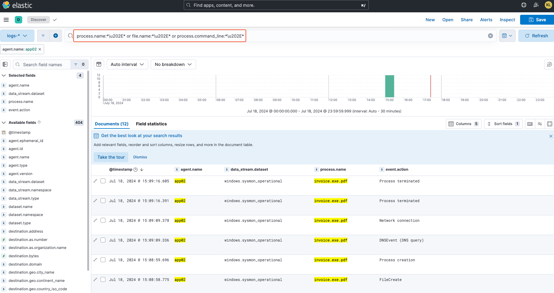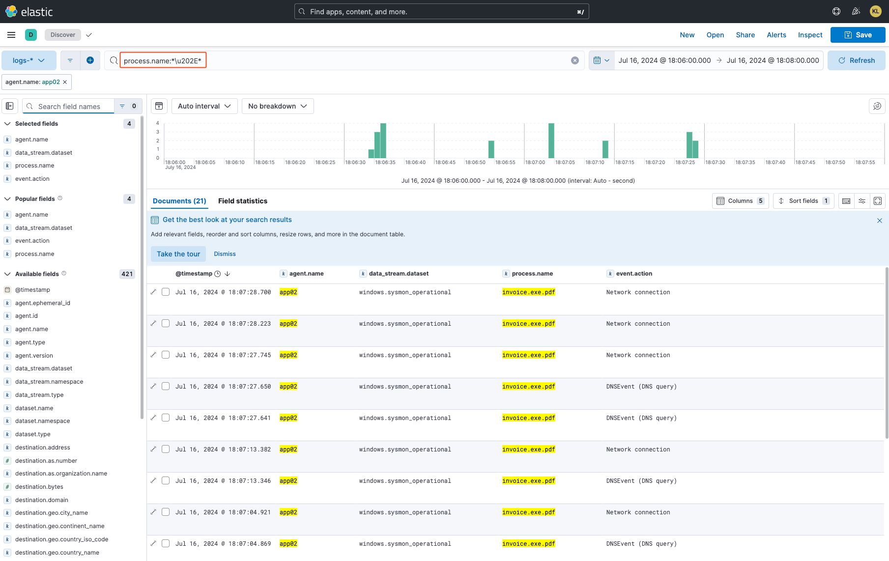 As evident in the preceding image, the query successfully detected the malicious process invoice.exe.pdf