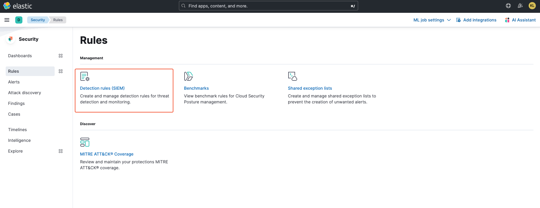 On the left side panel, under Security, click on Rules, then select Detection rules (SIEM).